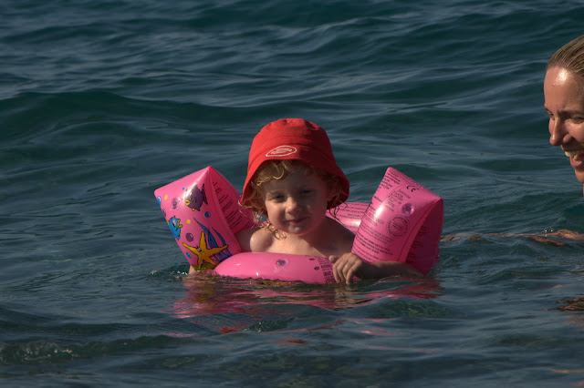 Vi tog ett par solstolar bredvid Benke & Sollan o sen ville Karma bada. Ulli har köpt armpuffar och en badring som Karma skulle få prova. Hon tyckte det var jättekul. Vi vuxna såg ut som bambi på hal is i vattenbrynet av all kullersten. Hur kunde man sprina på grus som liten? Vi bestämde oss för att införskaffa badskor. Efter ett tag ville Karma bada i poolen och vi blev häpna över hur duktig hon var på att manövrera i vattnet. hon tog sig precis dit hon ville med sin egen simstil.
